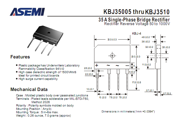 KBJ3506整流桥相关型号:KBJ3506、KBJ3508、KBJ3510