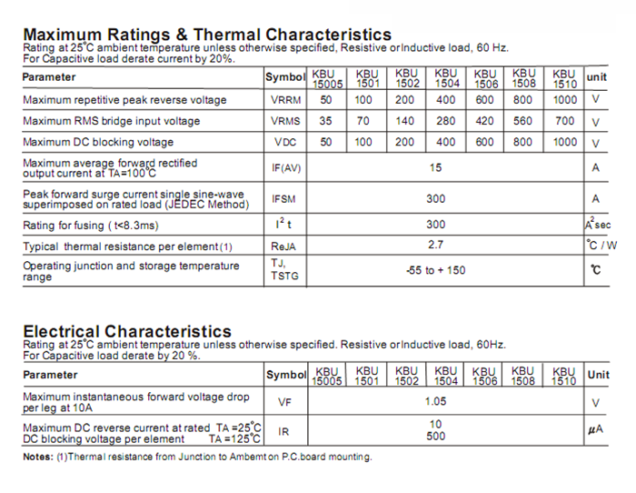 KBU整流桥相关型号:KBU1506、KBU1508、KBU1510