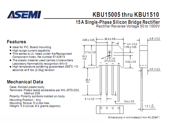 KBU整流桥相关型号:KBU1506、KBU1508、KBU1510